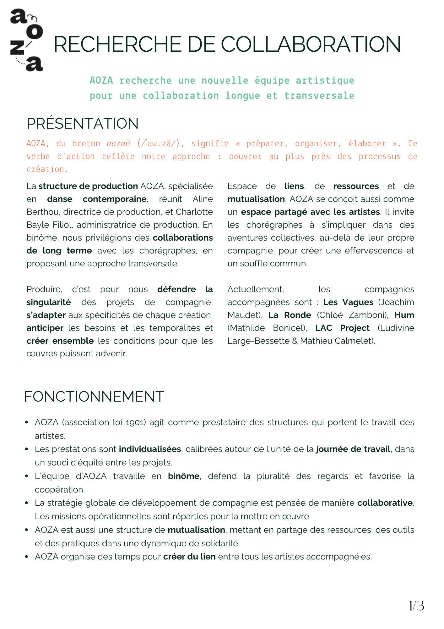 La structure de production AOZA, spécialisée en danse contemporaine, réunit Aline Berthou, directrice de production, et Charlotte Bayle Filiol, administratrice de production. En binôme, nous privilégions des collaborations de long terme avec les chorégraphes, en proposant une approche transversale.