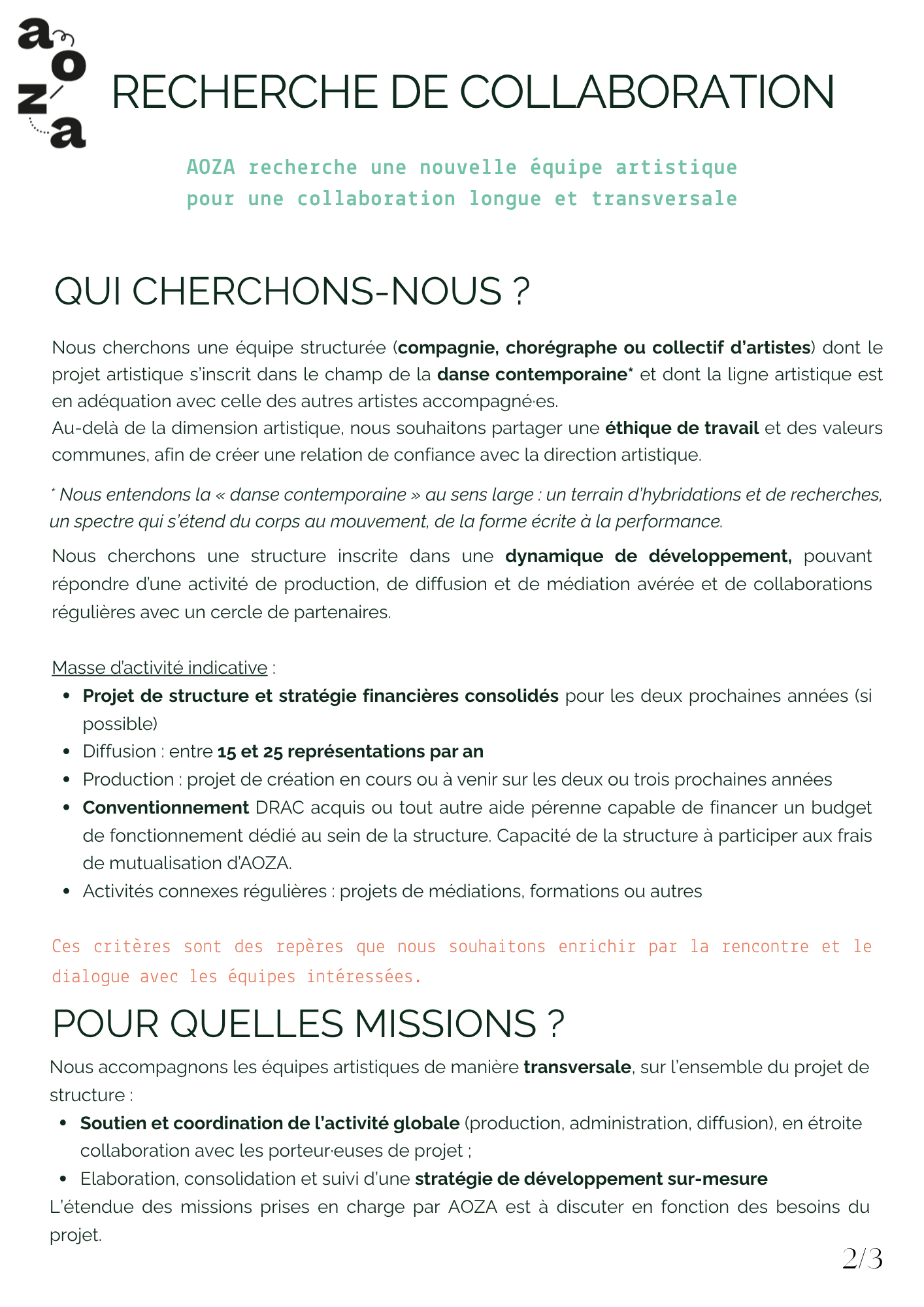 Espace de liens, de ressources et de mutualisation, AOZA se conçoit aussi comme un espace partagé avec les artistes. Il invite les chorégraphes à s’impliquer dans des aventures collectives, au-delà de leur propre compagnie, pour créer une effervescence et un souffle commun.