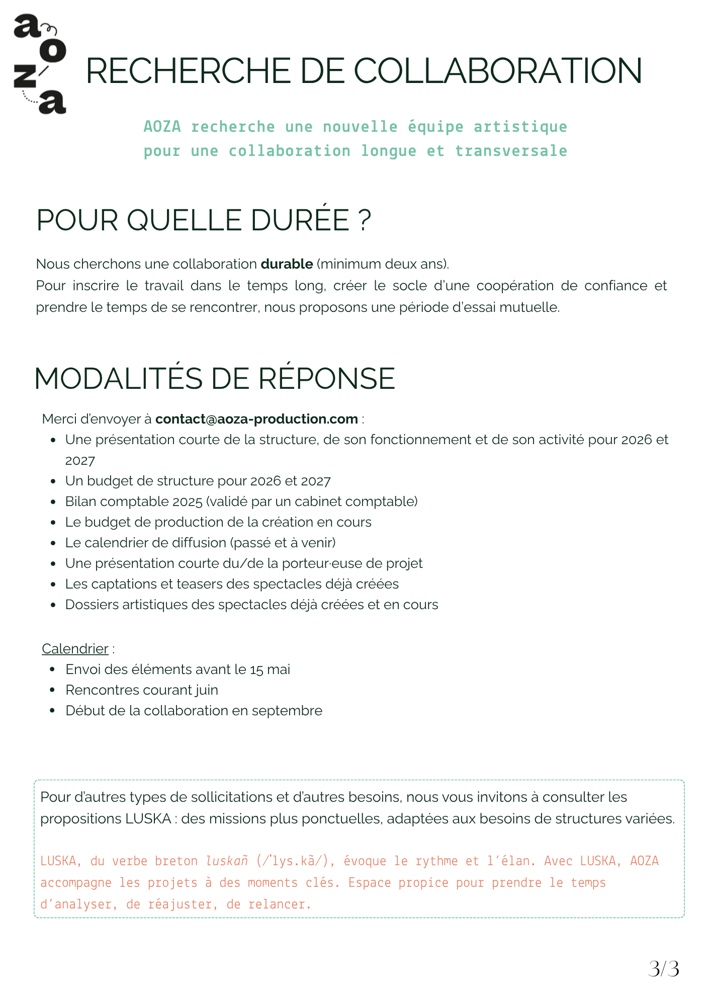 AOZA, du breton aozañ (/ˈaw.zã/), signifie « préparer, organiser, élaborer ». Ce verbe d’action reflète notre approche : oeuvrer au plus près des processus de création.